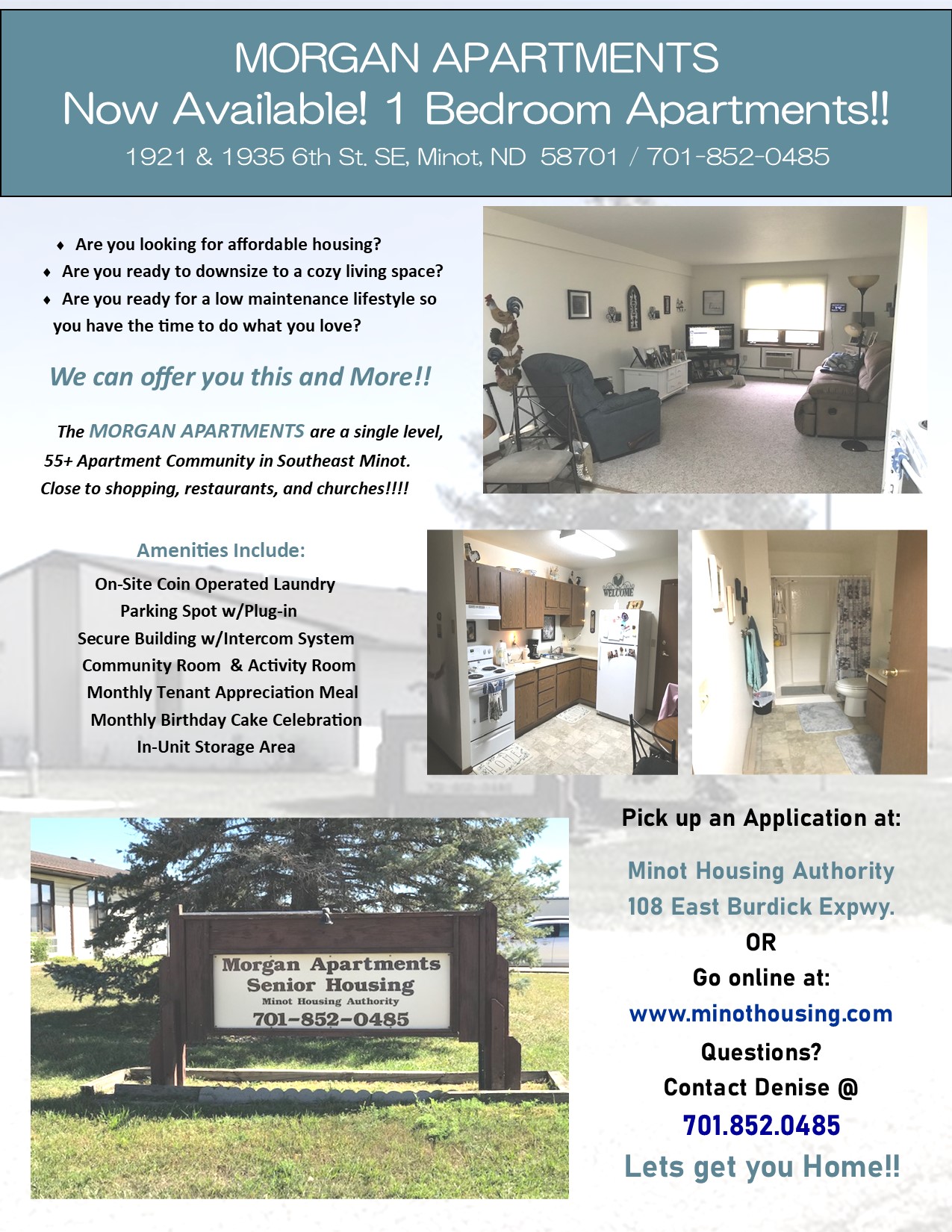 The Morgan Apartments are a single level 55 & Older apartment community located in Southeast Minot at 1921 and 1935 6th St SE. Close to shopping, restaurants, and churches; the Morgan Apartments pairs a phenomenal location with an even better atmosphere.